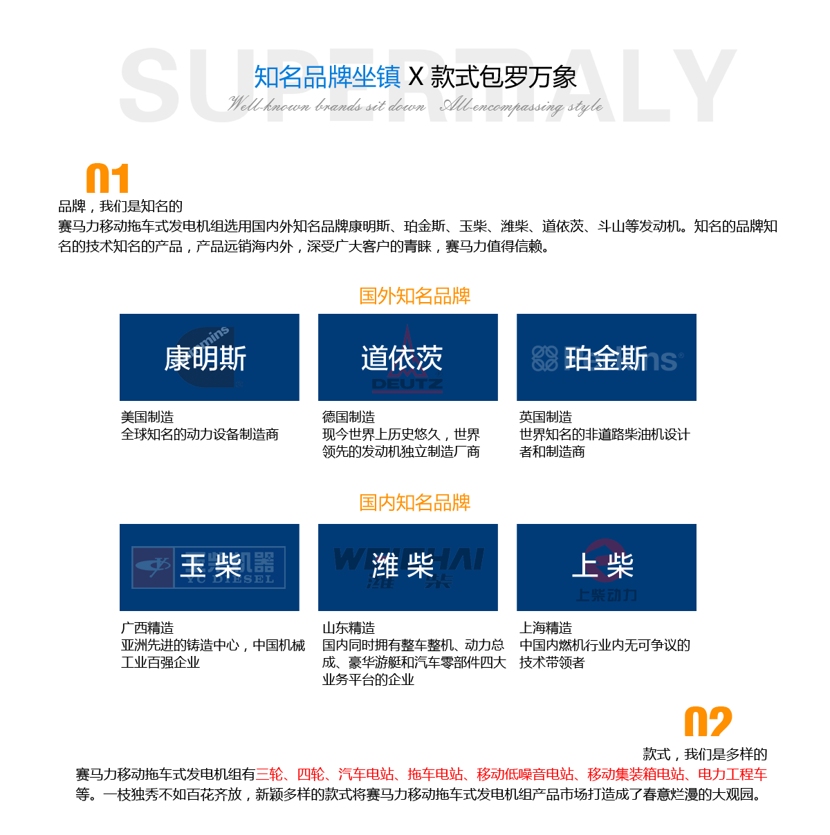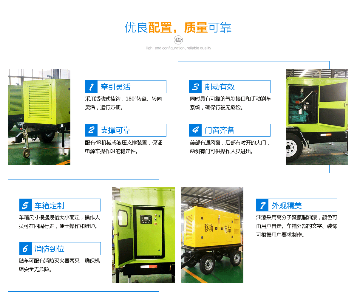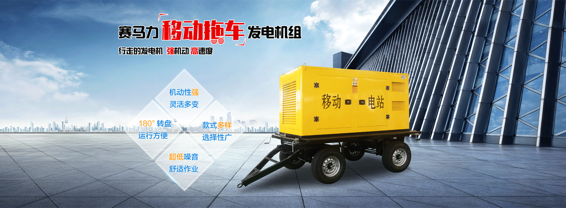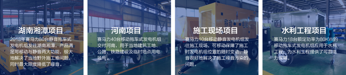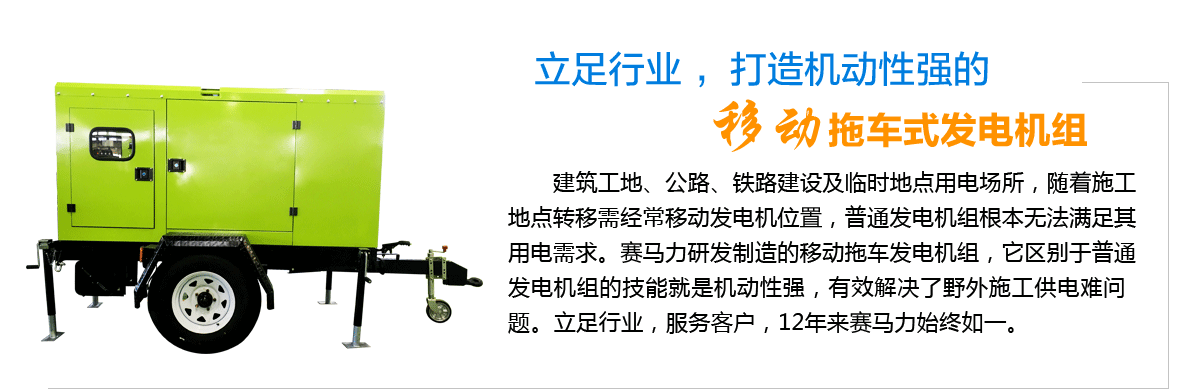 建筑工地、公路、铁路建设及临时地点用电场所,随着施工地点转移需经常移动发电机位置,普通发电机组根本无法满足其用电需求。赛马力研发制造的移动拖车发电机组,就是机动性强,有效解决了野外施工供电难问题。
