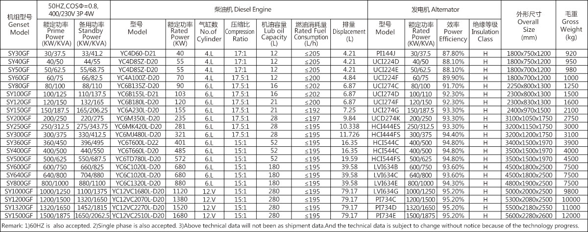 1.以上技术参数转速为1500RPM,频率50HZ,额定电压400/230V,功率因数0.8,接线方式为3相4线。60HZ发电机组可以根据客户的特殊需要定制。