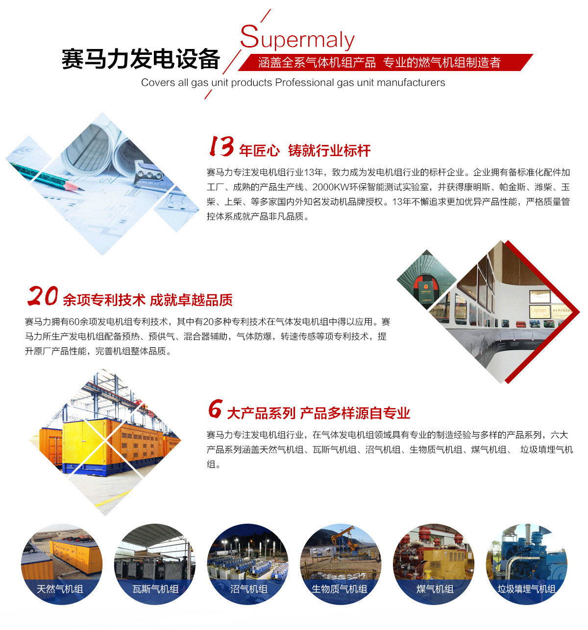 赛马力专注发电机组行业,在气体发电机组领域具有专业的制造经验与多样的产品系列,六大产品系列涵盖天然气机组、瓦斯气机组、沼气机组、生物质气机组、煤气机组、垃圾填埋气机组。