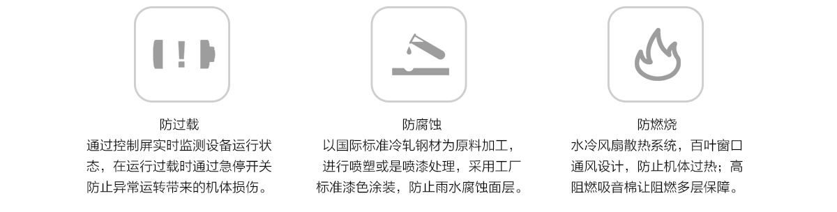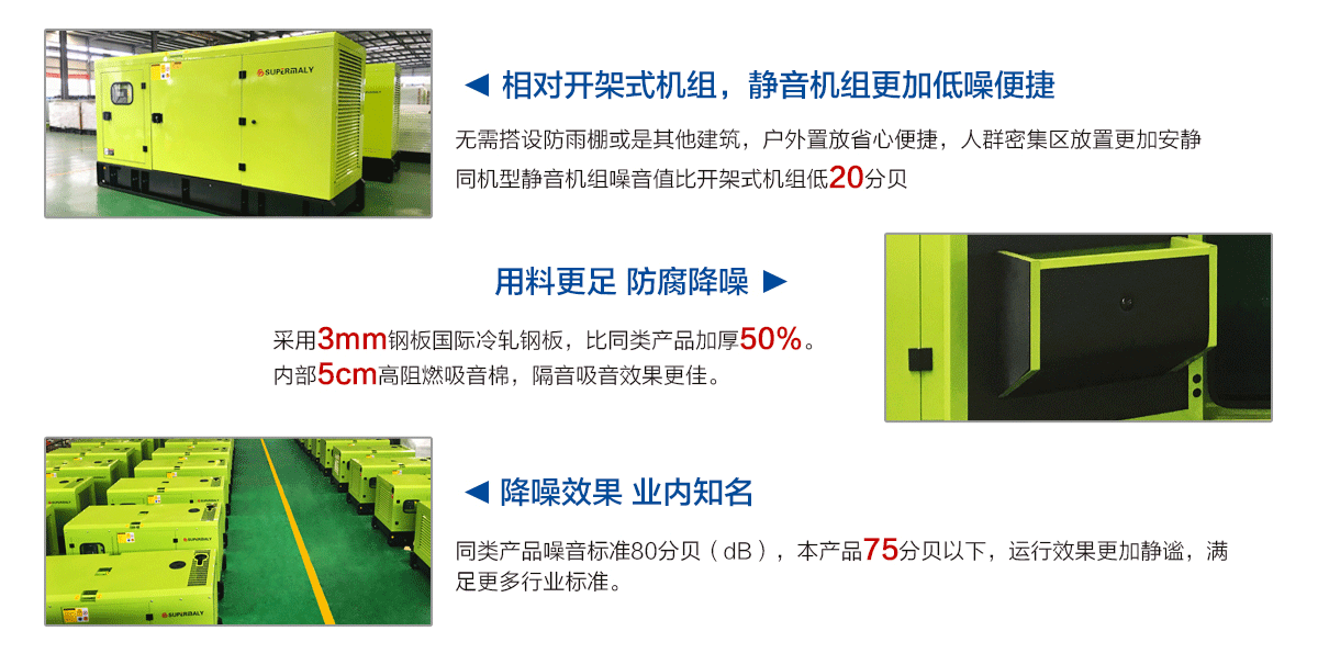 相对开架式机组,静音机组更加低噪便捷 无需搭设防雨棚或是其他建筑,户外置放省心便捷,人群密集区放置更加安静同机型静音机组噪音值比开架式机组低20分贝